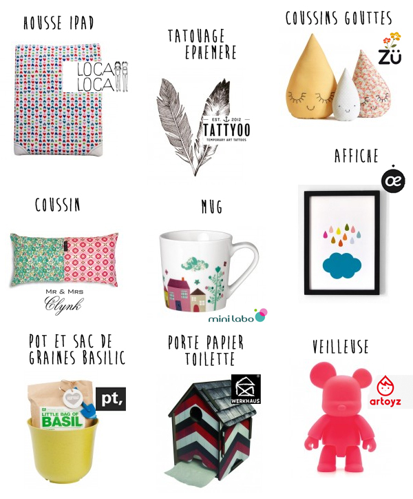housse pour ipad LOCA LOCA, tatouage éphémère TATTYO, coussins ZÜ, coussin Mr & Mrs Clynk, Mug MINI LABO, affiche OELWEIN, pot et sac de graines basilic PRESENT TIME, porte papier-toilette WERKHAUS, veilleuse ARTOYZ.